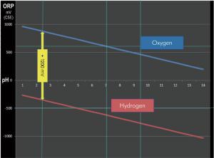 Entscheidend für die Aktivität (reduzierend oder oxidierend) ist die Menge der gelösten Gase Sauerstoff (oxidierend) und Wasserstoff (reduzierend). Nur durch diese gelösten Gase erhält das saure Wasser ein außergewöhnlich hohes, positives Redoxpotential (ORP) und das basische ein außergewöhnlich niedriges.Die Spanne liegt etwa zwischen +1200 mV (SHE) auf der Sauerstoffseite und (-) 600 mV (SHE) auf der Wasserstoffseite. Diese Werte beziehen sich auf eine Wasserstoff-Elektrode (SHE). In der Praxis misst man aber mit CSE Electrodes (common silver/silverchloride electrodes), womit sich Werte von ca. + 1000 mV (CSE) auf der Sauerstoff-Seite und Werte von ca. – 800 mV (CSE) auf der Wasserstoff-Seite messen lassen. Die Standard-Messung erfolgt bei 25º C, wo der Unterschied zur SHE-Messmethode bei 207 mV liegt. Die Beziehung der beiden Messwerte ist in der unten angeführten Grafik zu sehen.