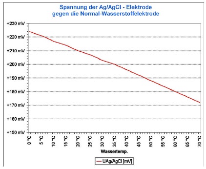 Oben: Spannungsvergleich SHE Elektrode gegenüber CSE Elektrode (rote Linie) bei verschiedenen Messtemperaturen. Bei normaler Trinkwassertemperatur muss man 220 mV zum abgelesenen CSE-Wert addieren, um auf den in der Wissenschaftüblichen SHE Standardwert zu kommen. Bei Raumtemperatur 207 mV. (Grafik: http://www.angewandte-geologie.geol.uni-erlangen.de/paramete.htm)